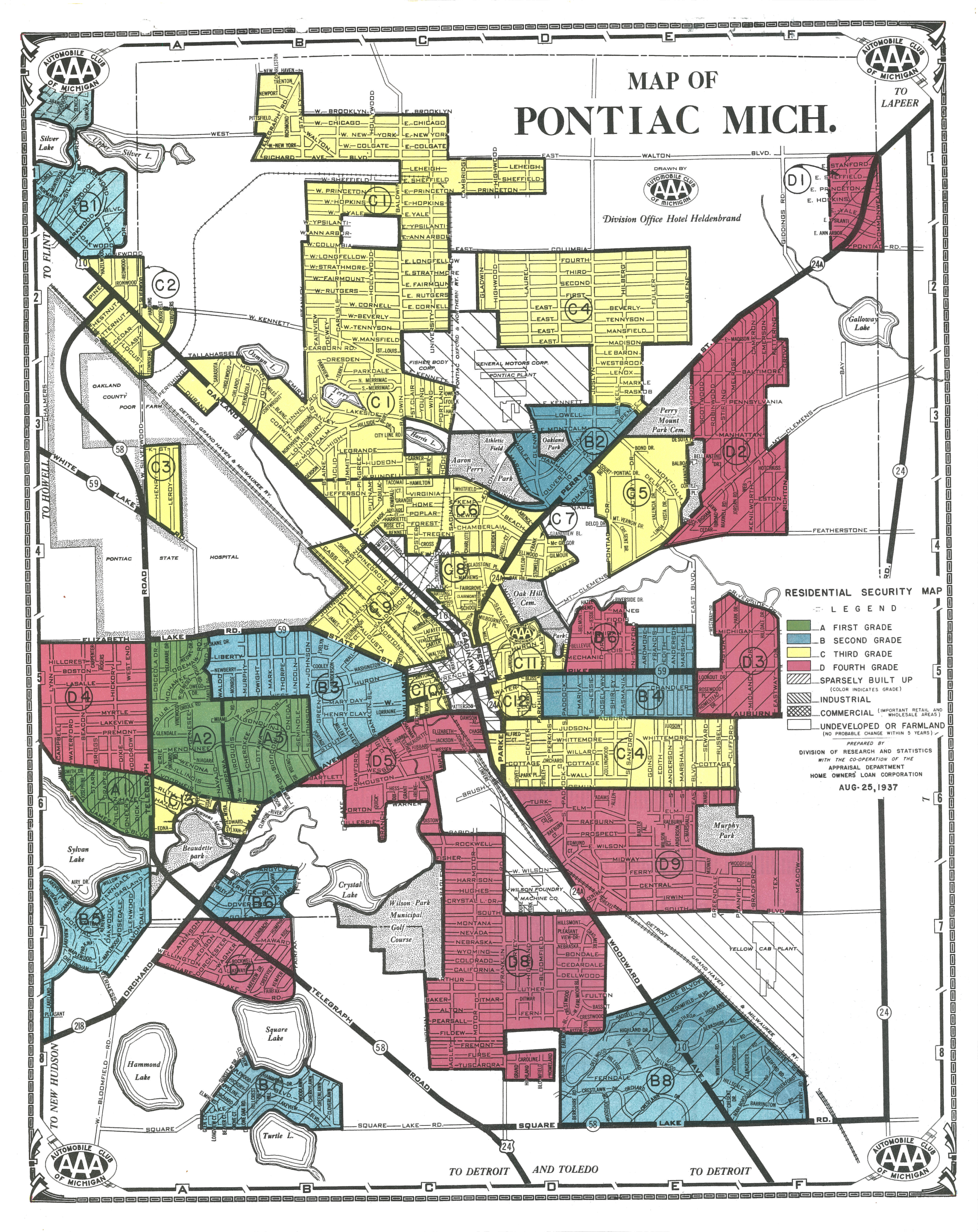 The federal government redline mapped Pontiac in August 25, 1937. Consistent with the requirements of the government Underwriting Manual, the redline mapping specifically targeted residents of color, deeming their neighborhoods as “hazardous” to investment because they had residents of color or were even near residents of color. The original redlining map is shown below. While HOLC did not itself implement these redlining maps, it promoted these practices and showed private industry groups and the FHA how to reproduce these maps. We also have a map overlaying the original HOLC boundaries on present-day segregation, which starkly show the continued effects of these racist practices. The strong visual connection between original HOLC grades and present-day racial segregation, shows a legacy of redline mapping on present-day outcomes.