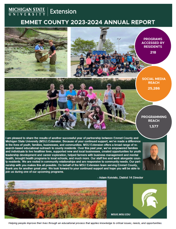 I am pleased to share the results of another successful year of partnership between Emmet County and Michigan State University (MSU) Extension. Because of your continued support, we’ve made a difference in the lives of youth, families, businesses, and communities. MSU Extension offers a broad range of re-search-based educational outreach to county residents. Over this past year, we’ve empowered families and individuals to live healthier lives, supported new and local businesses, created opportunities for youth leadership development and career exploration, helped farmers with business management and mental health, brought health programs to local schools, and much more. Our staff lives and work alongside coun-ty residents. We are rooted in community relationships and are responsive to community needs. Our part-nership with you makes this all possible. On behalf of the MSU Extension team serving Emmet County, thank you for another great year. We look forward to your continued support and hope you will be able to join us during one of our upcoming programs.