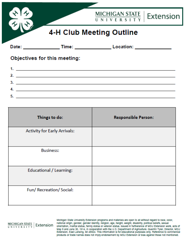 The 4-H Club Meeting Outline is a practical tool designed to help clubs stay organized during each meeting. Club leaders can use it to document key details such as project topics, meeting goals, and who is responsible for each task. Filling out the outline ensures everyone is on the same page and helps create a record that can be referenced later if questions or concerns arise. It’s a great way to keep meetings focused, productive, and transparent.