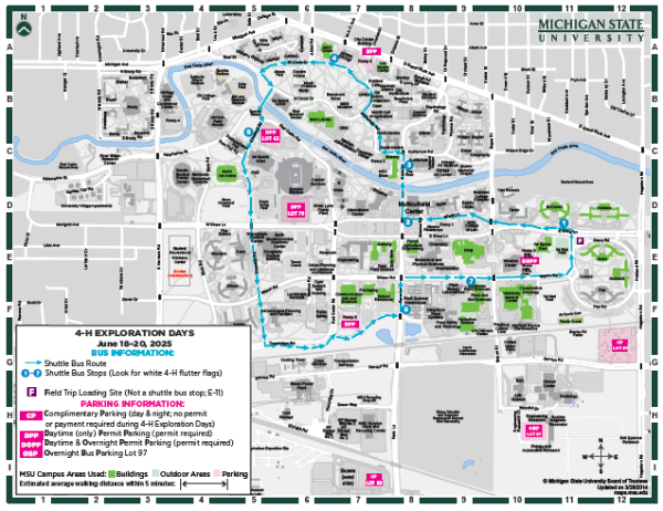 MSU main campus map for 2025 4-H Exploration Days bus route.