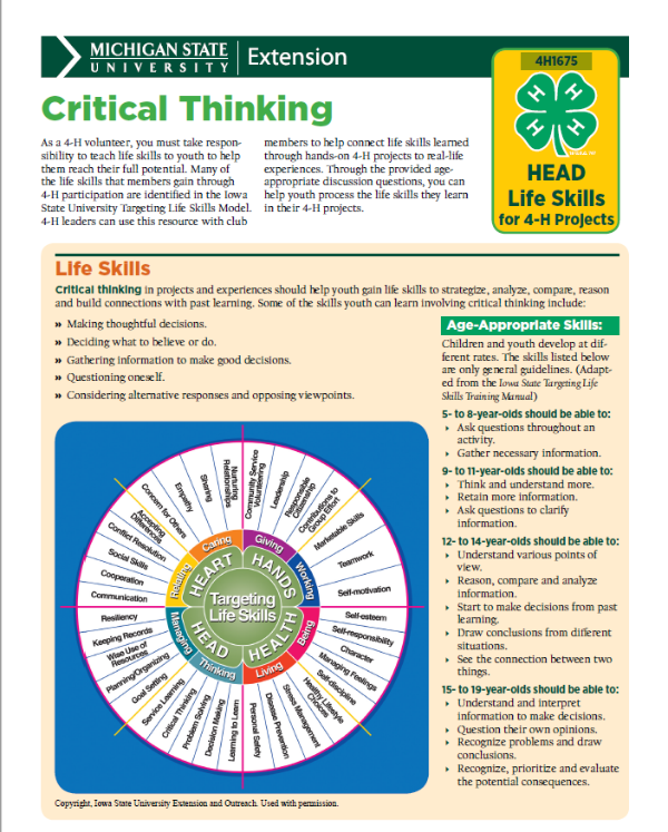 As a 4-H volunteer, you must take responsibility to teach life skills to youth to help them reach their full potential. Many of the life skills that members gain through 4-H participation are identified in the Iowa State University Targeting Life Skills Model. 4-H leaders can use this resource with club members to help connect life skills learned through hands-on 4-H projects to real-life experiences. The 4-H Head Life Skills sheets focus specifically on helping young people connect those life skills under the area of the head on the Targeting Life Skills Model.