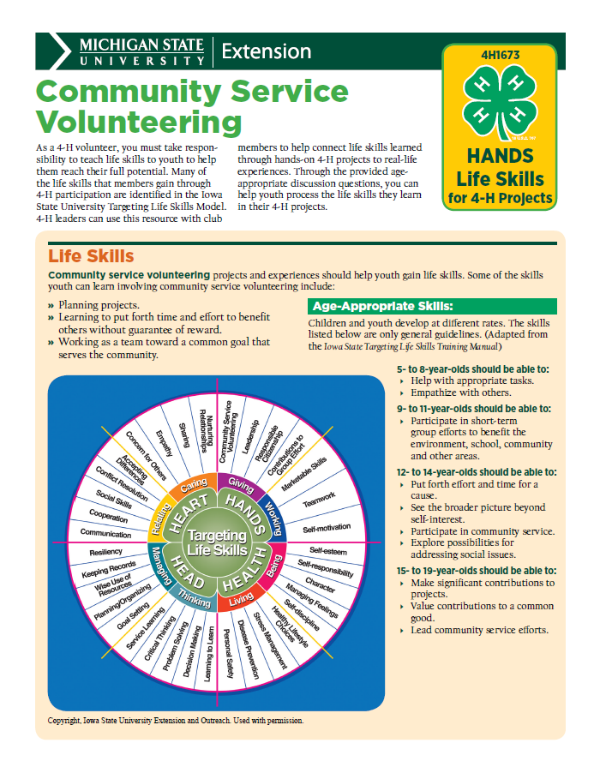 As a 4-H volunteer, you must take responsibility to teach life skills to youth to help them reach their full potential. Many of the life skills that members gain through 4-H participation are identified in the Iowa State University Targeting Life Skills Model. 4-H leaders can use this resource with club members to help connect life skills learned through hands-on 4-H projects to real-life experiences. The 4-H Head Life Skills sheets focus specifically on helping young people connect those life skills under the area of the hands on the Targeting Life Skills Model.