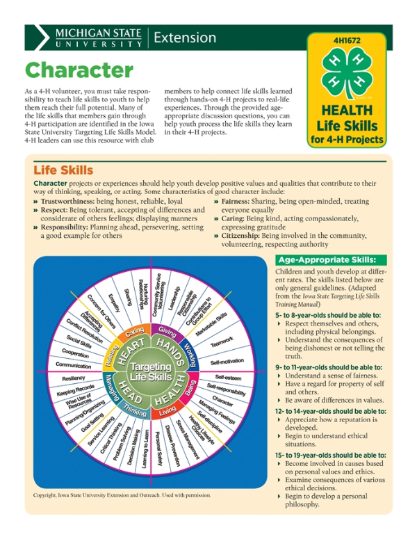 As a 4-H volunteer, you must take responsibility to teach life skills to youth to help them reach their full potential. Many of the life skills that members gain through 4-H participation are identified in the Iowa State University Targeting Life Skills model. 4-H leaders can use this resource with club members to help connect life skills learned through hands-on 4-H projects to real-life experiences. Through the provided age-appropriate discussion questions, you can help youth process the life skills they learn in their 4-H projects.