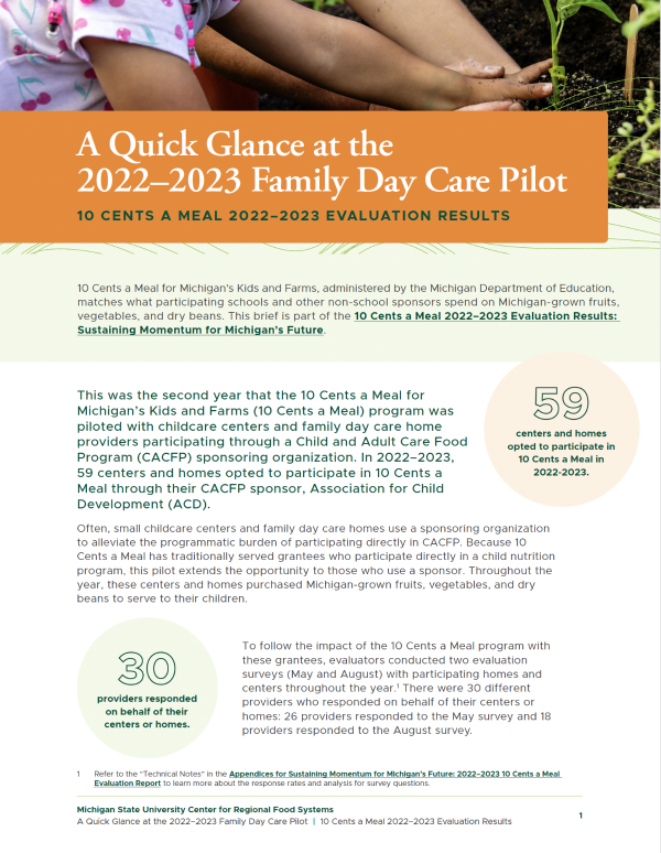 McManus, M., & Tsupros, M. (2024). A Quick Glance at the 2022-2023 Family Day Care Pilot: 10 Cents a Meal 2022–2023 Evaluation Results. Michigan State University Center for Regional Food Systems. https://www.canr.msu.edu/resources/a-quick-glance-at-the-2022-2023-family-day-care-pilot