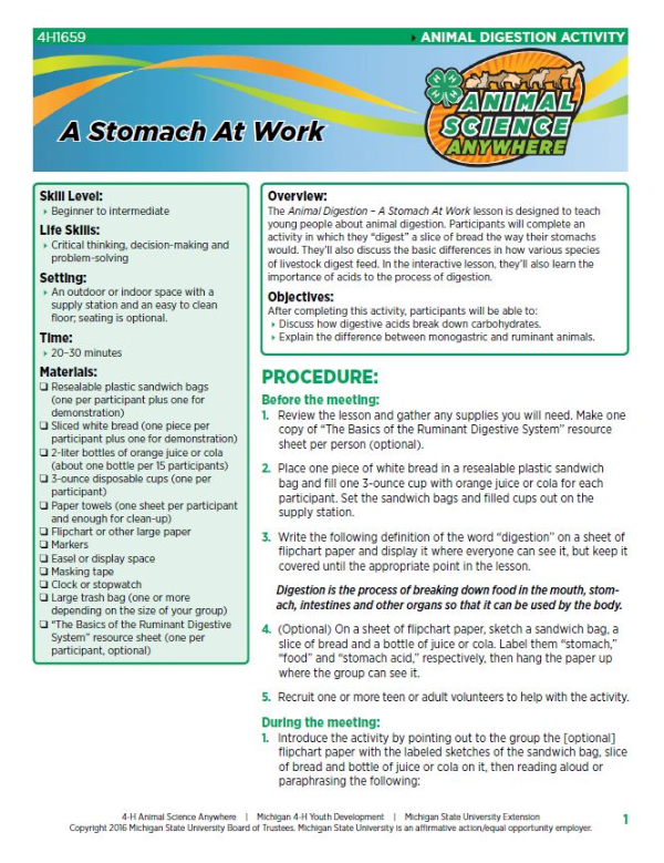 The Animal Digestion – A Stomach At Work lesson is designed to teach young people about animal digestion. Participants will complete an activity in which they “digest” a slice of bread the way their stomachs would. They’ll also discuss the basic differences in how various species of livestock digest feed. In the interactive lesson, they’ll also learn the importance of acids to the process of digestion.