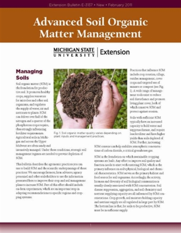 This bulletin describes the agronomic practices you can use to build SOM and the scientific underpinnings of those practices. We encourage farmers, farm advisors, agency personnel and other stakeholders to use the information presented here to improve their crop and soil management plans to increase SOM. Part of this effort should include on-farm experiments, which are an important step in adapting recommendations to specific regions and cropping systems.