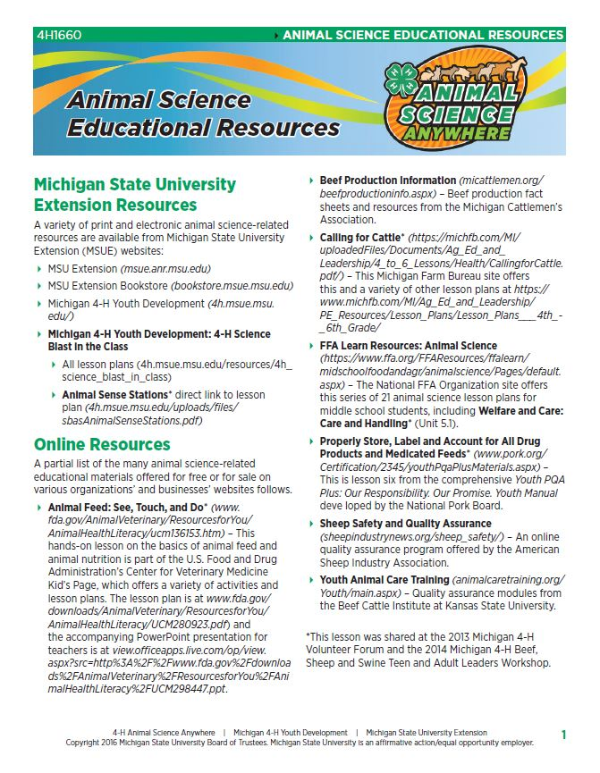 This document contains animal science educational resources for all your teaching needs. From MSU Extension website materials available in print and electronic form to other online resources recommend by extension to National 4-H curriculum.