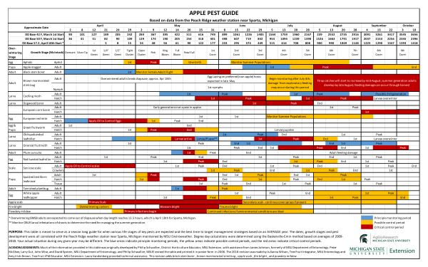 The 2018 revision was made by Julianna Wilson, Tree Fruit Integrator, MSU Entomology and Amy Irish-Brown, Tree Fruit IPM Educator, MSU Extension. Laura Vandenberg provided technical assistance. This revision adds black stem borer , brown marmorated stink bug , apple scab , fire blight , and powdery mildew.
