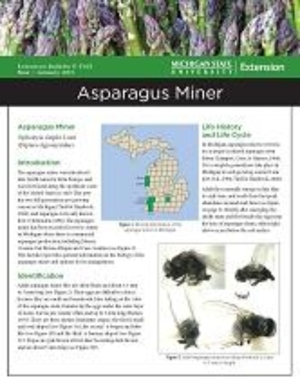 The asparagus miner was introduced into North America from Europe, and was first found along the northeast coast of the United States in 1869. This pest has two full generations per growing season in Michigan (Tuell & Hausbeck, 2008), and asparagus is its only known host (Chittenden, 1898). The asparagus miner has been recorded in every county in Michigan where there is commercial asparagus production, including Mason, Oceana, Van Buren, Allegan and Cass counties (see Figure 1). This factsheet provides general information on the biology of the asparagus miner and options for its management.