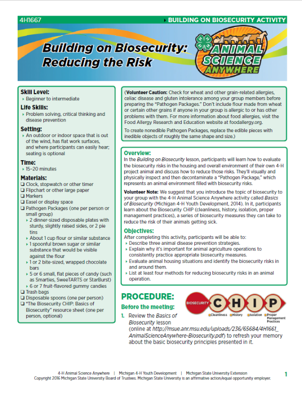 Volunteer Note: We suggest that you introduce the topic of biosecurity to your group with the 4-H Animal Science Anywhere activity called Basics of Biosecurity (Michigan 4-H Youth Development, 2014). In it, participants learn about the Biosecurity CHIP (cleanliness, history, isolation, proper management practices), a series of biosecurity measures they can take to reduce the risk of their animals getting sick.