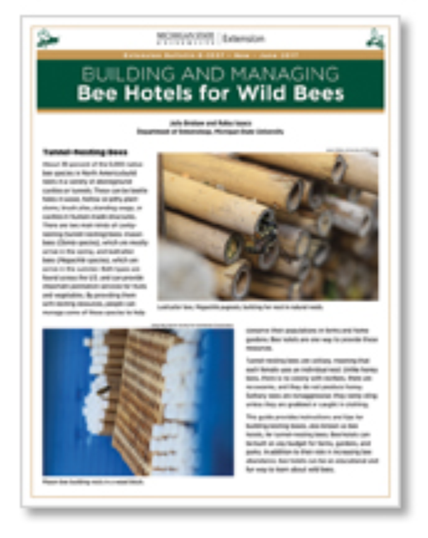 This guide provides instructions and tips for building nesting boxes, also known as bee hotels, for tunnel-nesting bees. Bee hotels can be built on any budget for farms, gardens, and parks. In addition to their role for increasing bee abundance, building bee hotels can be educational and fun for people learning about wild bees.