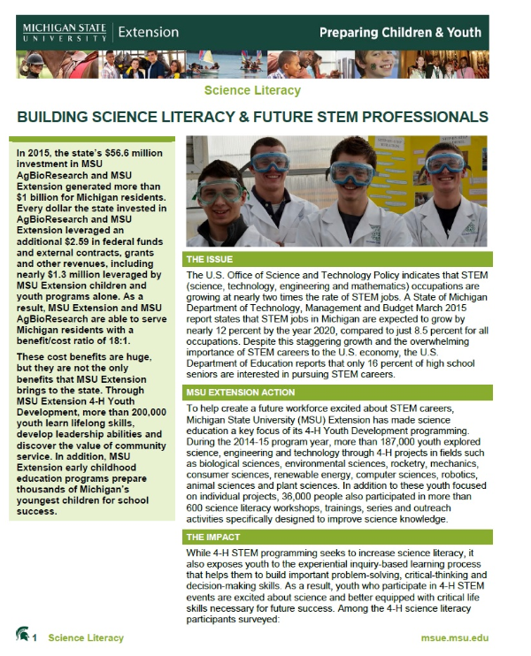 To help create a future workforce excited about STEM careers, Michigan State University (MSU) Extension has made science education a key focus of its 4-H Youth Development programming. During the 2014-15 program year, more than 187,000 youth explored science, engineering and technology through 4-H projects in fields such as biological sciences, environmental sciences, rocketry, mechanics, consumer sciences, renewable energy, computer sciences, robotics, animal sciences and plant sciences. In addition to these youth focused on individual projects, 36,000 people also participated in more than 600 science literacy workshops, trainings, series and outreach activities specifically designed to improve science knowledge.