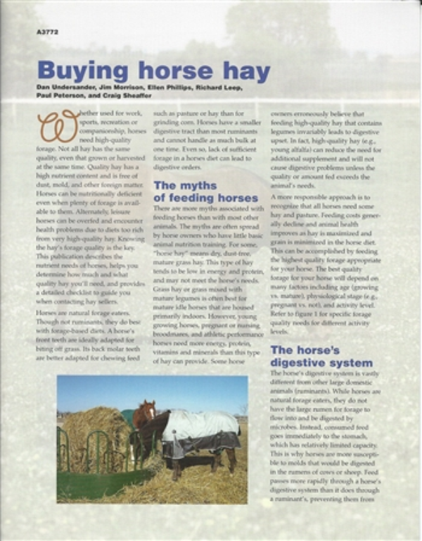 Whether used for work, sports, recreation or companionship, horses need high-quality forage. Not all hay has the same quality, even that grown or harvested at the same time. Quality hay has a high nutrient content and is free of dust, mold, and other foreign matter. Horses can be nutritionally deficient even when plenty of forage is available to them. Alternately, leisure horses can be overfed and encounter health problems due to diets too rich from very high-quality hay. Knowing the hay's forage quality is the key. This publication describes the nutrient needs of horses, helps you determine how much and what quality hay you'll need, and provides a detailed checklist to guide you when contacting hay sellers.