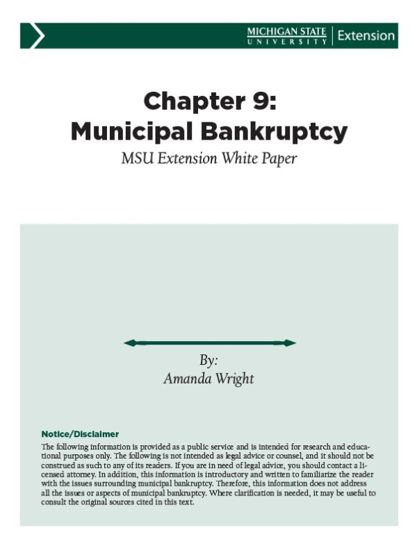 A introduction to Chapter 9 municipal bankruptcy, including eligibility, requirements, creditor negotiation tests, the plan of adjustment, Chapter 9 vs. Chapter 11 and the advantages and disadvantages of a municipality filing for Chapter 9 bankruptcy.