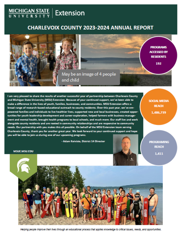 I am very pleased to share the results of another successful year of partnership between Charlevoix County and Michigan State University (MSU) Extension. Because of your continued support, we’ve been able to make a difference in the lives of youth, families, businesses, and communities. MSU Extension offers a broad range of research-based educational outreach to county residents. Over this past year, we’ve empowered families and individuals to live healthier lives, supported new and local businesses, created opportunities for youth leadership development and career exploration, helped farmers with business management and mental health, brought health programs to local schools, and much more. Our staff live and work alongside county residents and are rooted in community relationships and are responsive to community needs. Our partnership with you makes this all possible. On behalf of the MSU Extension team serving Charlevoix County, thank you for another great year. We look forward to your continued support and hope you will be able to join us during one of our upcoming programs.