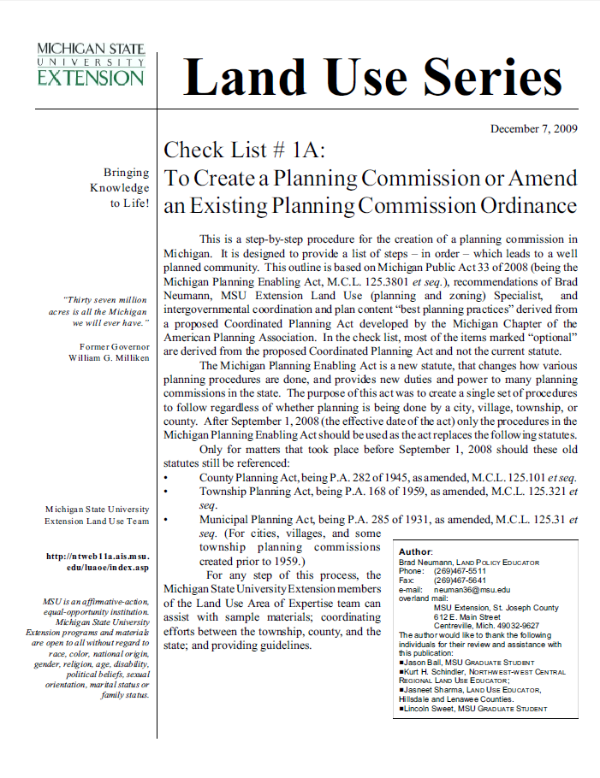 This is a step-by-step procedure for the creation of a planning commission in Michigan. It is designed to provide a list of steps – in order – which leads to a well planned community.