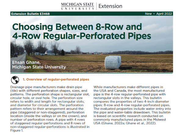 While manufacturers make different pipes in the USA and Canada, the most manufactured pipe is the 4-row regular-perforated pipe with rectangular slots in the valleys. This bulletin compares the properties of two 4-inch diameter pipes: 8 row and 4-row regular-perforated pipes. The evaluated properties include water entry into the pipe and water-table drawdown. This bulletin is based on scientific research conducted on commonly manufactured pipes in the Midwest USA (Ghane, 2022a; Ghane et al., 2022).