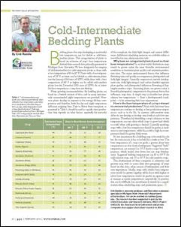 Bedding plants that stop developing at moderately low temperatures can be labeled as cold-intermediate plants. This categorization is based on estimates of base temperatures derived from research data primarily generated at Michigan State University.