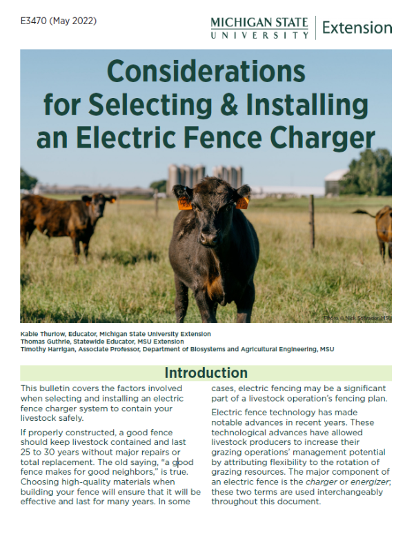 Electric fence technology has made notable advances in recent years. These technological advances have allowed livestock producers to increase their grazing operations’ management potential by attributing flexibility to the rotation of grazing resources. The major component of an electric fence is the charger or energizer; these two terms are used interchangeably throughout this document.