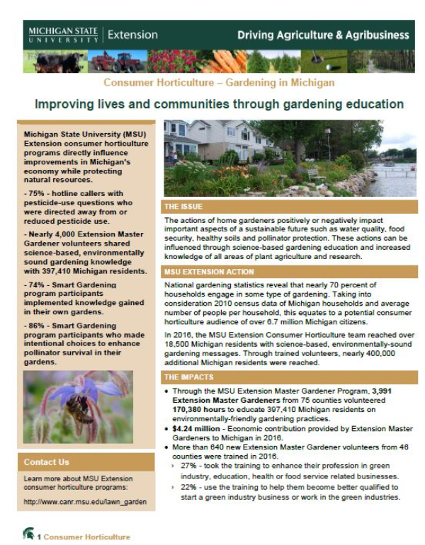 Michigan State University (MSU) Extension consumer horticulture programs directly influence improvements in Michigan's economy while protecting natural resources.