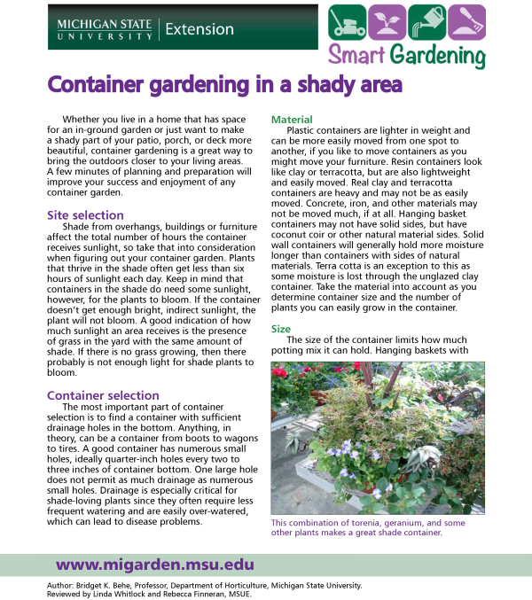 Whether you live in a home that has space for an in-ground garden or just want to make a shady part of your patio, porch, or deck more beautiful, container gardening is a great way to bring the outdoors closer to your living areas. A few minutes of planning and preparation will improve your success and enjoyment of any container garden.