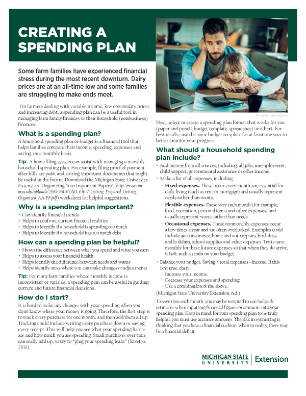 For farmers dealing with variable income, low commodity prices and increasing debt, a spending plan can be a useful tool in managing farm family finances or their household (nonbusiness) finances.