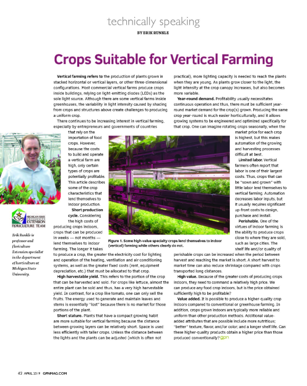 The costs to build and operate an indoor (vertical) farm are high, so only certain types of crops are potentially profitable. This articles discusses some some of the crop characteristics that lend themselves to indoor production.