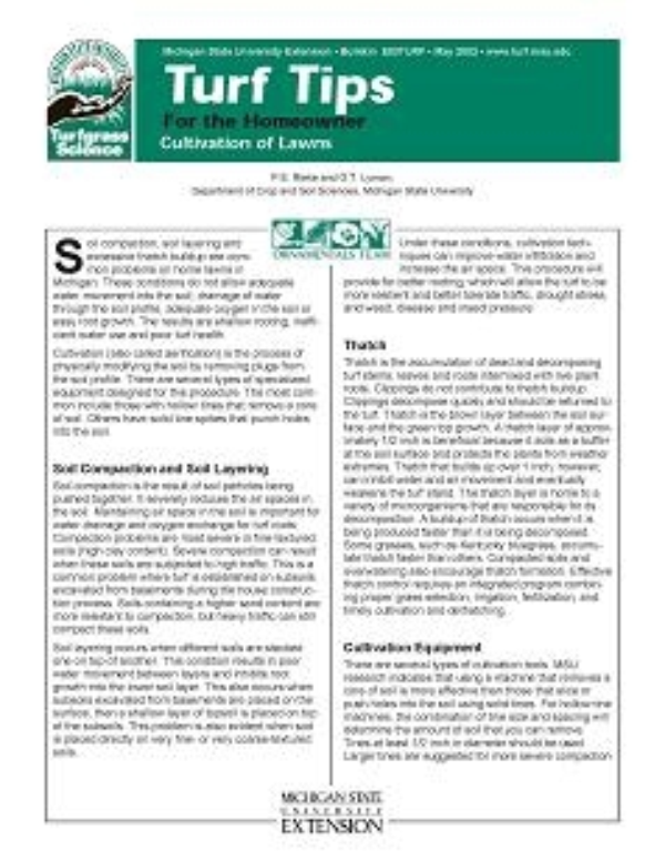Soil compaction, soil layering and excessive thatch buildup are common problems on home lawns in Michigan. These conditions do not allow adequate water movement into the soil, drainage of water through the soil profile, adequate oxygen in the soil or easy root growth. The results are shallow rooting, inefficient water use and poor turf health.