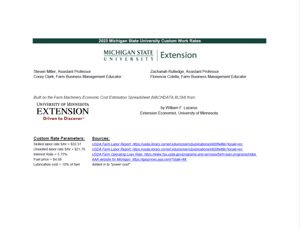 The 2025 Custom Work Rates report covers a wide number of basic field machine operations. It provides a summary of the estimated costs of these operations based on the University of Minnesota’s Machinery Economic Cost Estimates worksheet. The MSU version published here provides Michigan-based estimates of the costs of operating machinery in these different production tasks. This publication also divides the costs into some of their component parts.