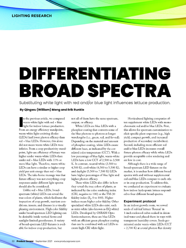 In part 2 of a 5-part series on the production of leafy greens indoors, this article discusses how substituting white light (broad spectra) with red and/or blue light influences lettuce production.
