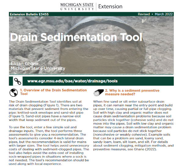 To use the tool, enter a few simple soil and drainage inputs. Then, the tool performs three assessments to give you a recommendation. The tool’s assessments consider 4-inch lateral drain pipes, but the recommendation is valid for mains with larger sizes. The tool helps avoid unnecessary costs of dealing with sediment-clogged pipes. The tool also helps avoid the extra cost of installing sock-wrapped pipes in situations where a sock is not needed. The tool’s recommendation should be used along with local experience.