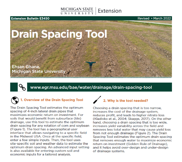 The Drain Spacing Tool estimates the optimum spacing of 4-inch lateral drain pipes that maximizes economic return on investment. For soils that would benefit from subsurface (tile) drainage, use this tool to estimate the optimum drain spacing for any rotation of corn and soybean. The tool has a geographical user interface that allows navigating to a specific field in the Midwest USA. Once at the specific field, enter a few simple inputs. Then, the tool uses site-specific soil and weather data to estimate the optimum drain spacing. An advanced input setting is also available for entering custom soil and economic inputs for a tailored analysis.