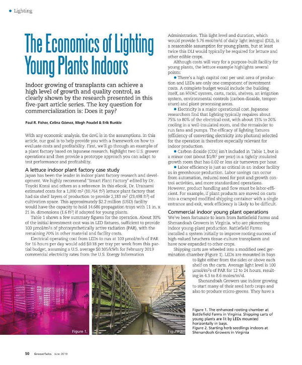 This article provides the framework of the economics and profitability of indoor lighting of young plants (transplants). It includes example costs for an indoor plant factory in Japan, and provides highlights for indoor lighting used by two commercial growers in the U.S.