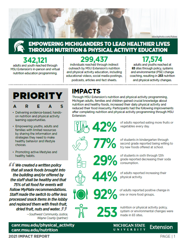 - 342,121 adults and youth reached through MSU Extension's in-person and virtual nutrition education programming.