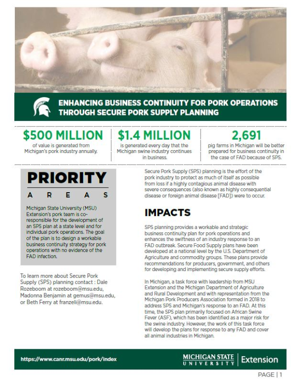 Michigan State University (MSU) Extension’s pork team is co-responsible for the development of an SPS plan at a state level and for individual pork operations. The goal of the plan is to design a workable business continuity strategy for pork operations with no evidence of the FAD infection.