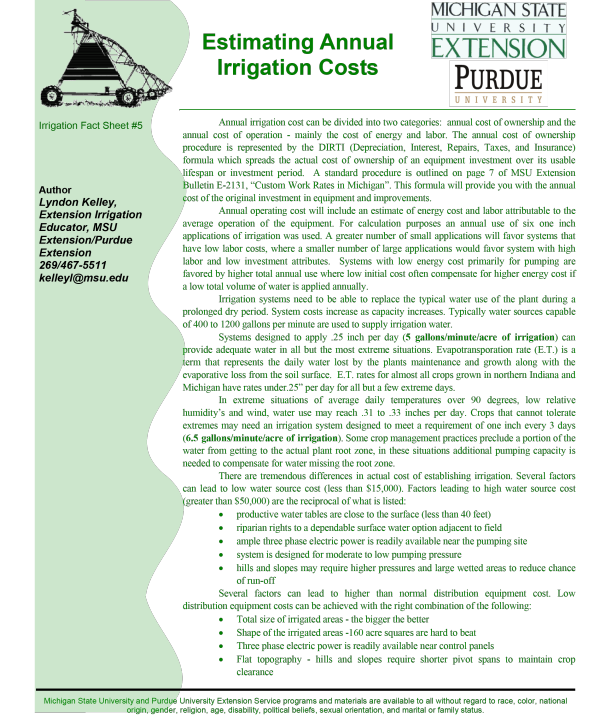Annual irrigation cost can be divided into two categories: annual cost of ownership and the annual cost of operation - mainly the cost of energy and labor. The annual cost of ownership procedure is represented by the DIRTI (Depreciation, Interest, Repairs, Taxes, and Insurance) formula which spreads the actual cost of ownership of an equipment investment over its usable lifespan or investment period. A standard procedure is outlined on page 7 of MSU Extension Bulletin E-2131, “Custom Work Rates in Michigan”. This formula will provide you with the annual cost of the original investment in equipment and improvements.