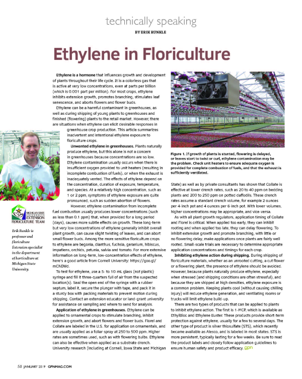 Ethylene can be a harmful contaminant in greenhouses and during shipping, but there are also situations when ethylene can elicit desirable responses in greenhouse crop production.
