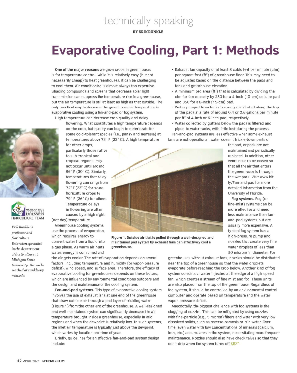 The only practical way to decrease the greenhouse air temperature is evaporative cooling using a fan-and-pad or fog system. This article provides a short overview of these two systems.