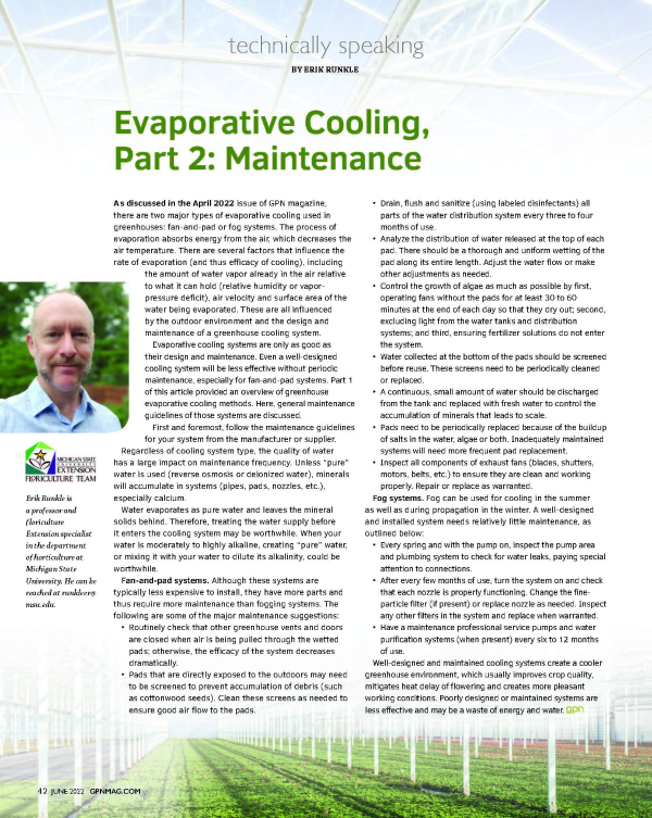 Evaporative cooling systems are only as good as their design and maintenance. In this article, general maintenance guidelines of these systems are discussed for greenhouse applications.