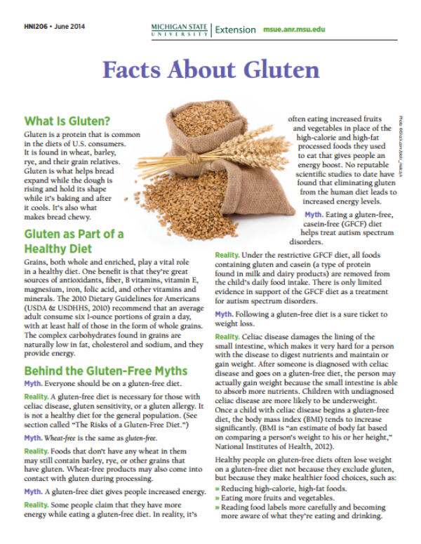 U.S. Food and Drug Administration. (2014). Gluten and food labeling: FDA’s regulation of “gluten-free” claims. Silver Spring, MD: Author. Retrieved from www.fda.gov/Food/ ResourcesForYou/Consumers/ucm367654.htm