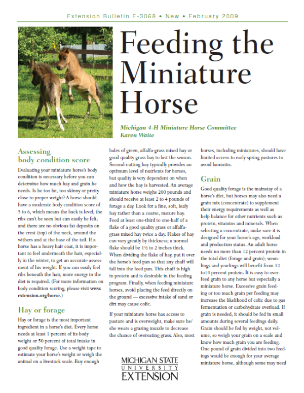 Good quality forage is the mainstay of a horse’s diet, but horses may also need a grain mix (concentrate) to supplement their energy requirements as well as help balance for other nutrients such as protein, vitamins and minerals. When selecting a concentrate, make sure it is designed for your horse’s age, workload and production status. An adult horse needs no more than 12 percent protein in the total diet (forage and grain); weanlings and yearlings will benefit from 12 to14 percent protein. It is easy to overfeed grain to any horse but especially a miniature horse. Excessive grain feeding or too much grain per feeding may increase the likelihood of colic due to gas fermentation or carbohydrate overload. If grain is needed, it should be fed in small amounts during several feedings daily. Grain should be fed by weight, not volume, so weigh your grain on a scale and know how much grain you are feeding. One pound of grain divided into two feedings would be enough for your average miniature horse, although some may need slightly more on the basis of their body condition score. If your horse tends to get fat, try a supplement that is designed to balance nutrients for the forage you are feeding, and one that can be fed in very small amounts.