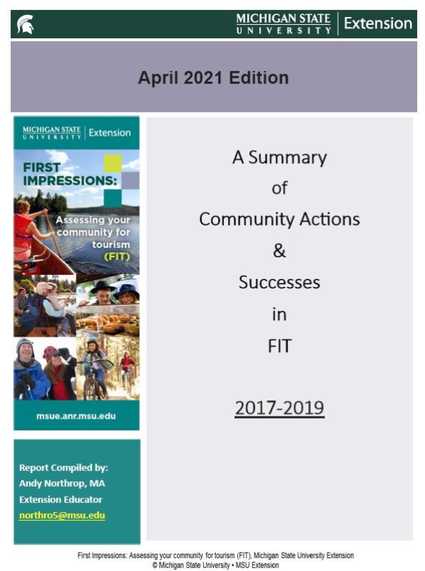 FIT has proven to be the catalyst needed to launch and expand small town tourism across Michigan. Launched in 2017 as a solution to drive community‐driven tourism, FIT has provided rural leaders and their stakeholders opportunities to collaborate around suggestions from first‐time visiting tourists to their community. This report focuses on the actions and successes implemented by several small town Michigan communities that participated in the FIT program between 2017‐2019.