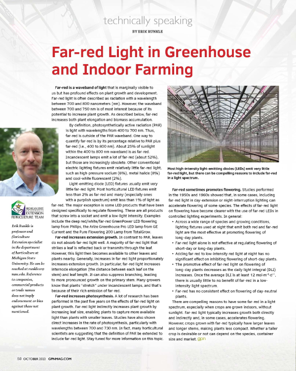 Far red is a waveband of light that is marginally visible to us but has profound effects on plant growth and development; it increases both plant elongation and biomass accumulation.