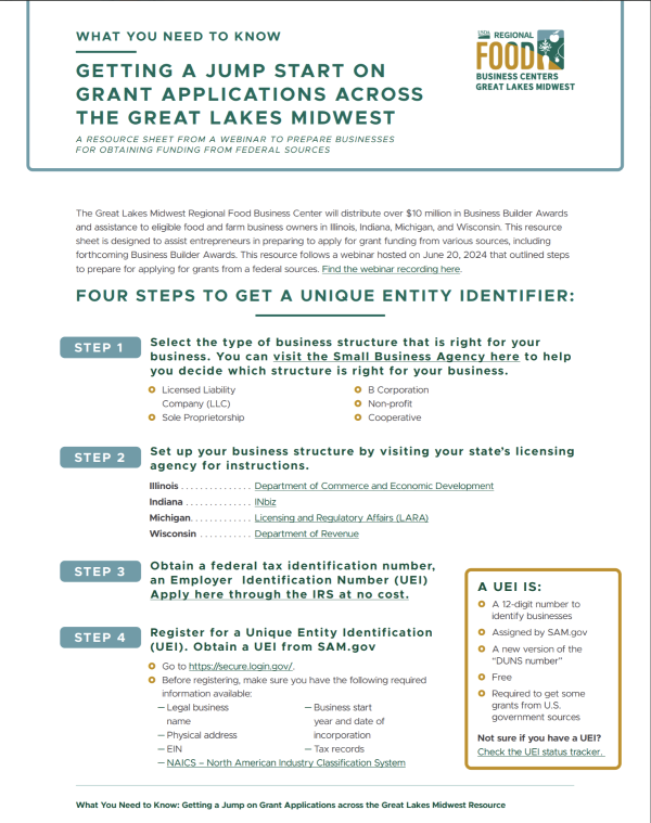 This resource sheet is designed to assist entrepreneurs in preparing to apply for grant funding from various sources, including forthcoming Business Builder subawards from the Great Lakes Midwest Regional Food Business Center.