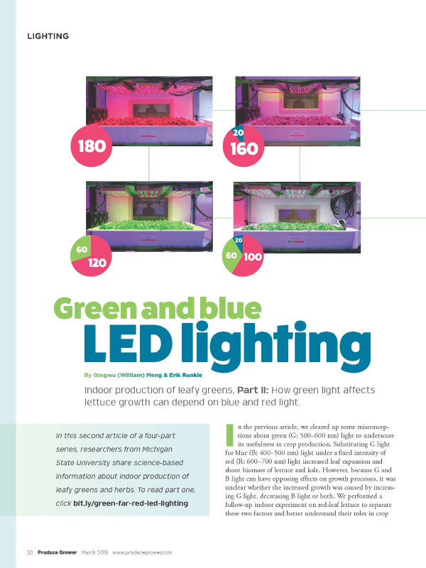 Indoor production of leafy greens, Part 2 of 4: How green light affects lettuce growth can depend on blue and red light.