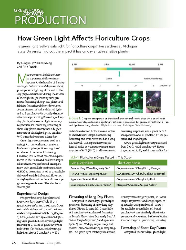 Is green light really a safe light for floriculture crops? Researchers at Michigan State University find out the impact it has on crops that flower in response to the day length.