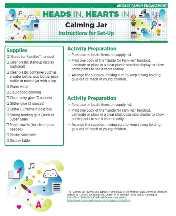 In this activity, you will make a calming jar with the child. As you make the calming jar, let the child choose the colors and add the ingredients. Once the calming jar is made, shake it up and encourage the child to watch the glitter slowly settle to the bottom of the jar. When the child is feeling overwhelmed or experiencing a strong emotion, encourage them to shake up the jar and wait for the glitter to settle to the bottom of the jar. This gives them a few moments to calm down and manage their strong feelings. Have them shake up the calming jar as many times as they need until they feel calmer.