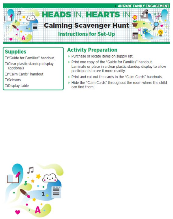 In this activity, you will help the child go on a hunt for calming techniques. Teaching the child lots of ways to help them feel calm and connected when they feel overwhelmed and out of control will help prepare them to handle their big emotions. During the scavenger hunt, you and the child will get to practice five techniques for feeling calm including stretches and breathing techniques.