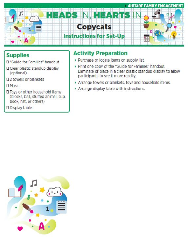 In this activity, you will practice modeling with the child by being copycats. They will practice copy in and following you, and you will practice following and copying them as you do various activities. This will help you tune in and pay attention to the child as you copy their behaviors and help the child tune in and pay attention to you.