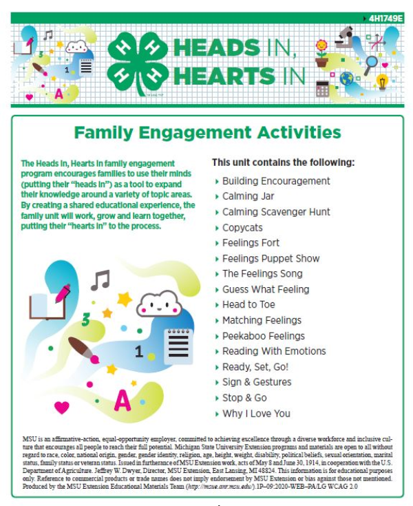 The Heads In, Hearts In family enrichment program encourages families to use their minds as a tool to expand their knowledge around a variety of topic areas. This packet contains all 16 family engagement activities.